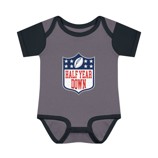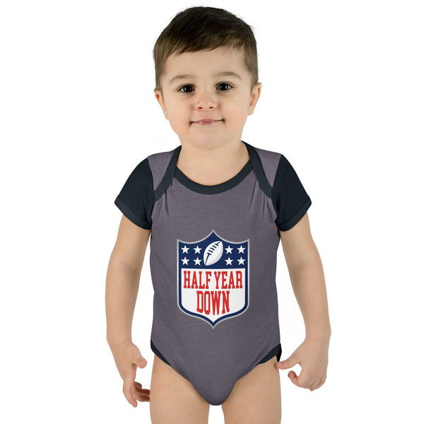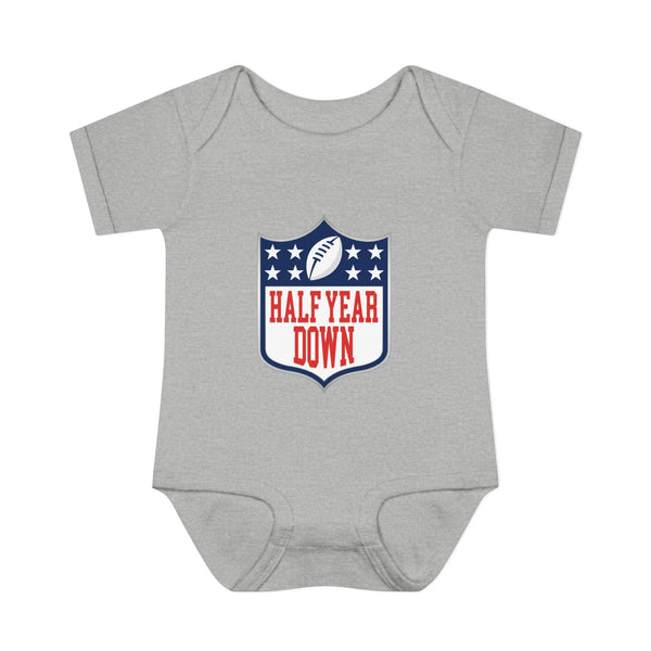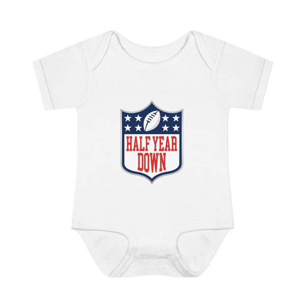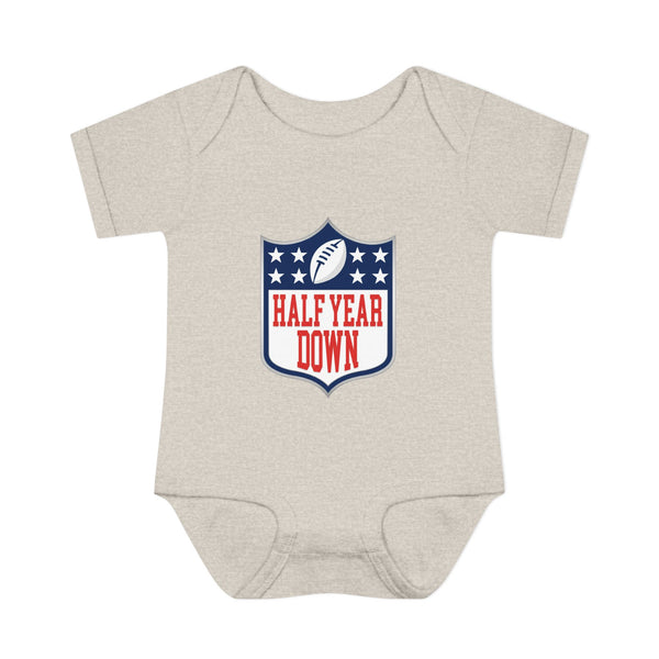Celebrate your little MVP’s 6-month milestone with our "Half Year Down" baby onesie. Inspired by the classic football shield, this design is for families who live for game day and want their newest recruit to look the part.